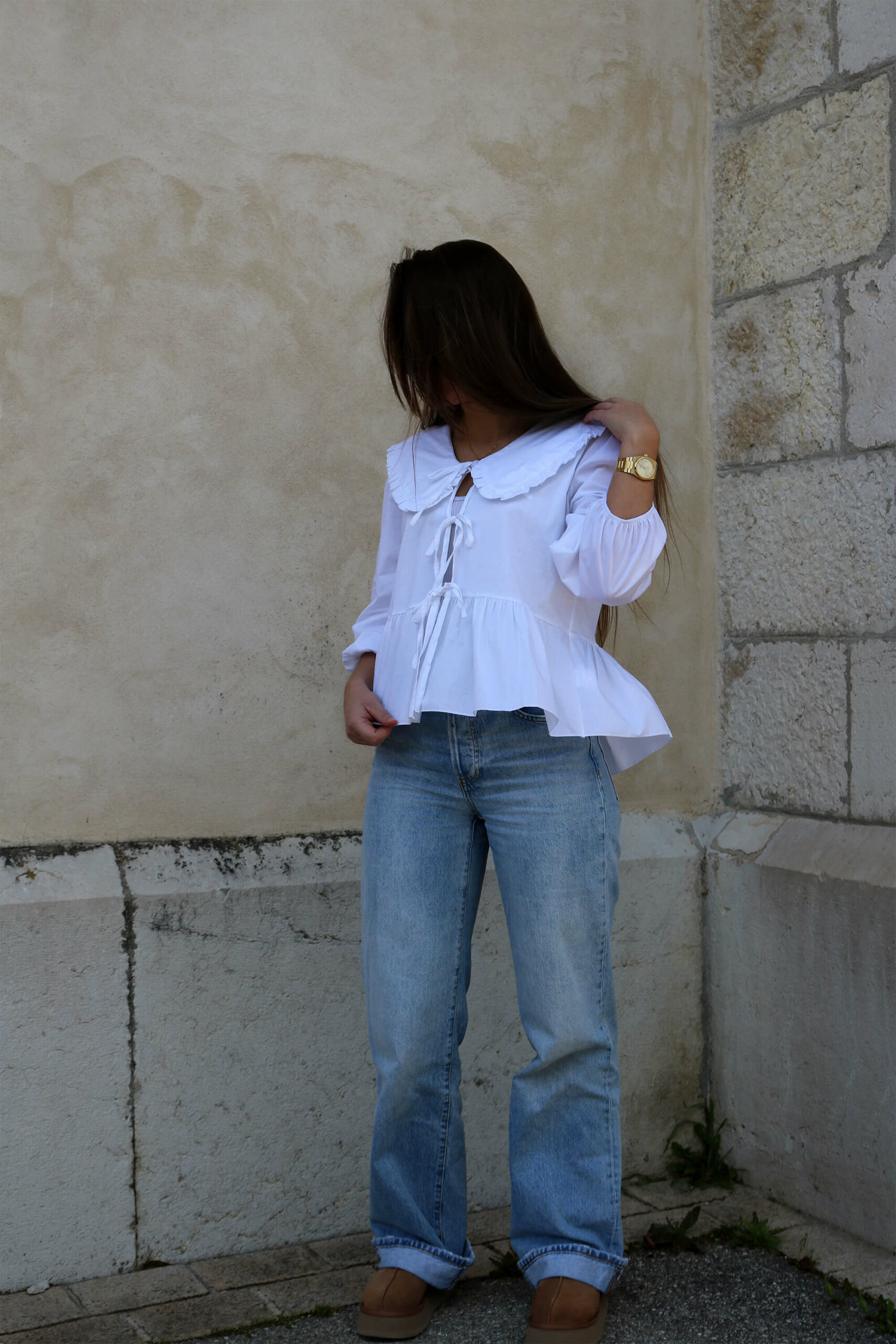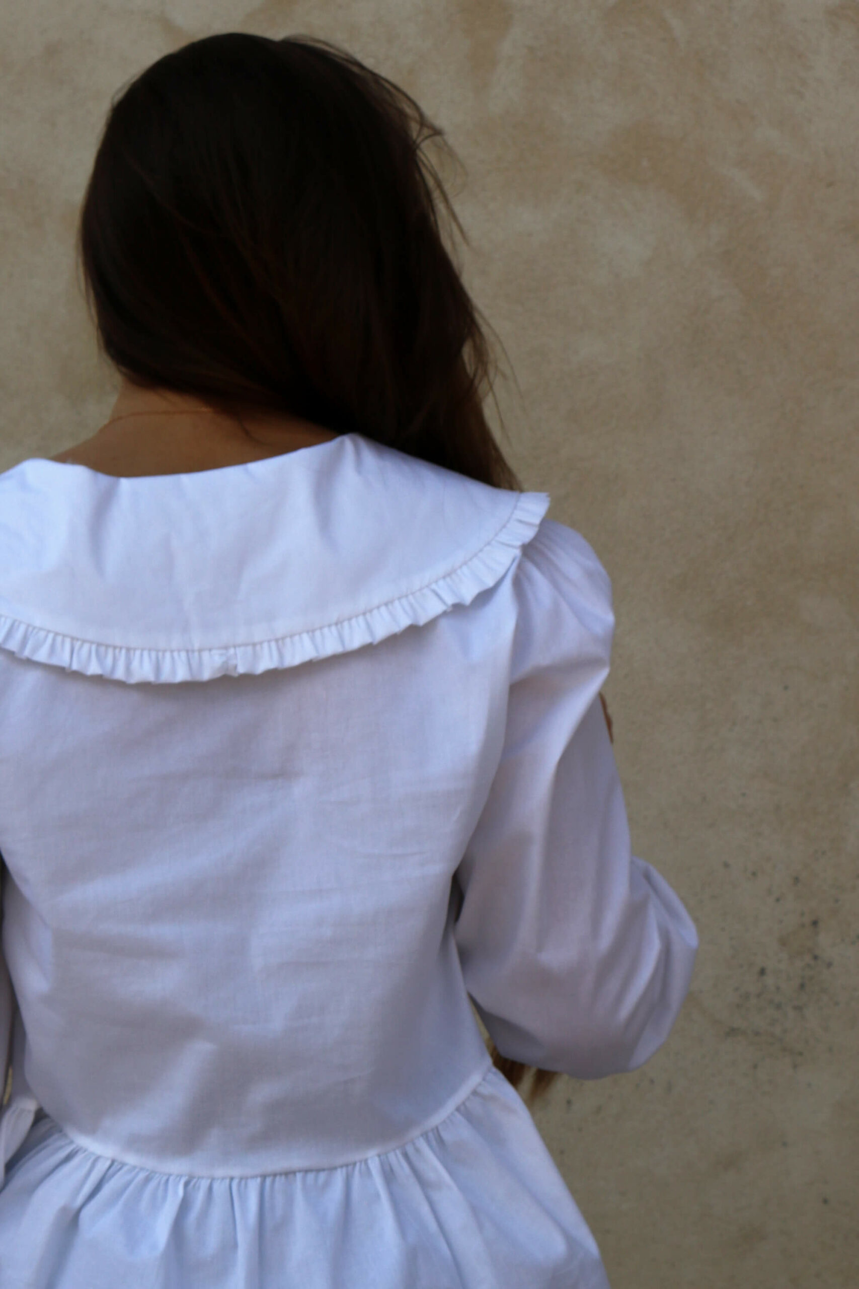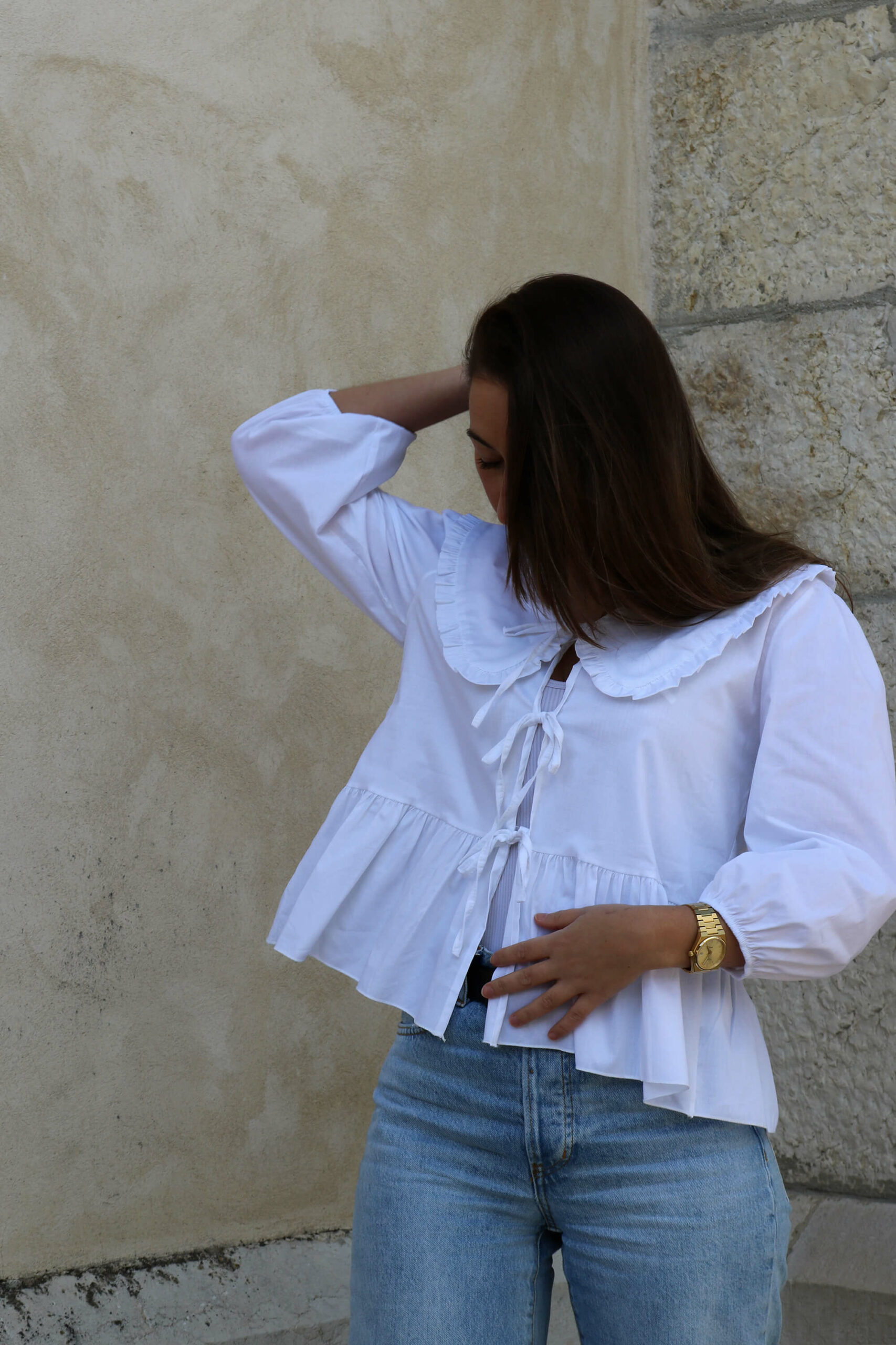 La blouse avec des noeuds à nouer à l’avant : la nouvelle grande tendance ! La blouse blanche Atea dispose de trois noeuds sur l’avant, de manches longues légèrement bouffantes, d’un magnifique col Claudine très élégant et de fronces sur le bas pour un style romantique.