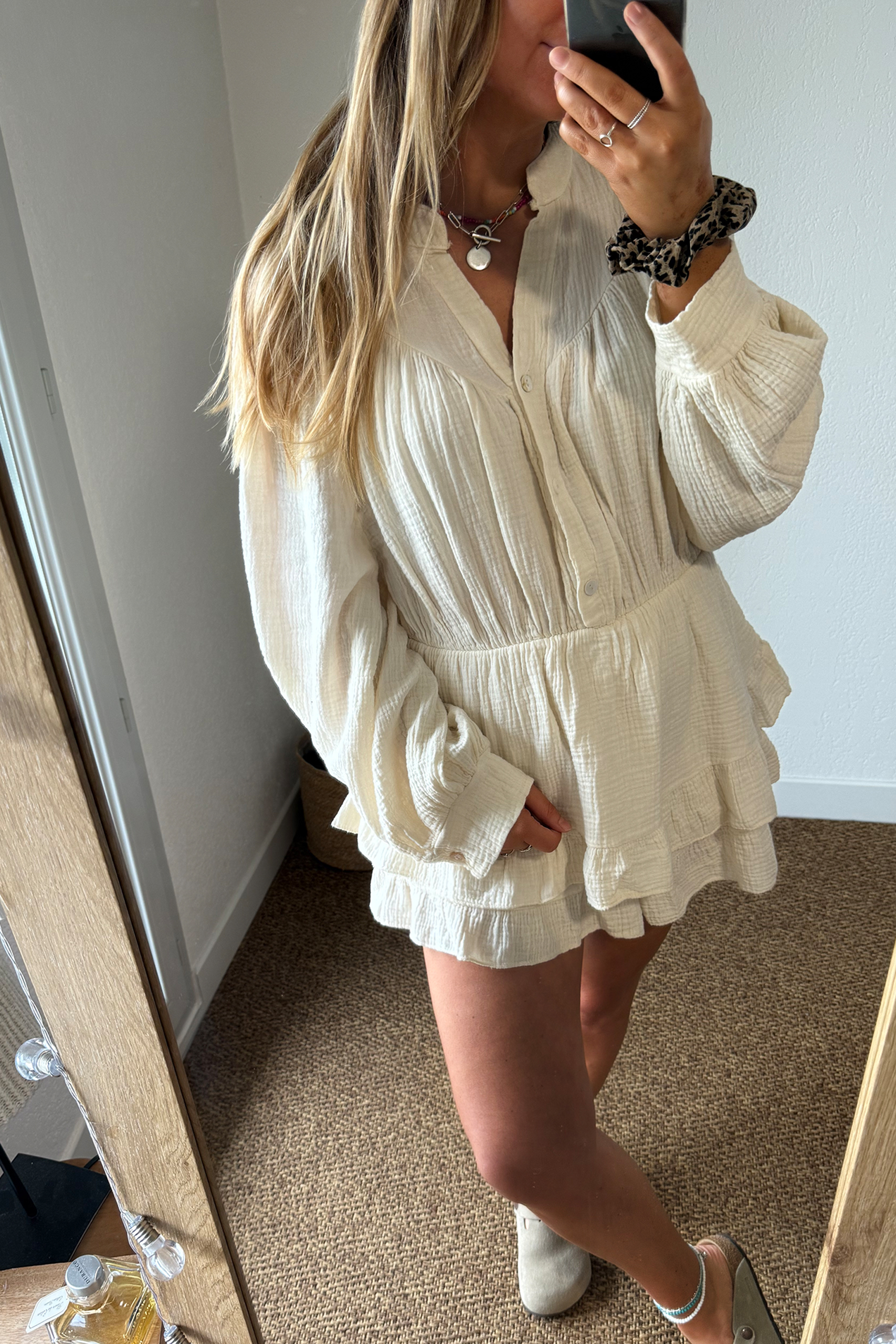 Adoptez un style bohème et décontracté avec cette combishort beige en gaze de coton. Légère et fluide, elle se distingue par son effet bouffant au niveau des manches et ses volants élégants au niveau du short, offrant un look à la fois féminin et tendance. Parfaite pour les journées estivales, elle allie confort et esprit bohème pour une silhouette moderne et aérienne.