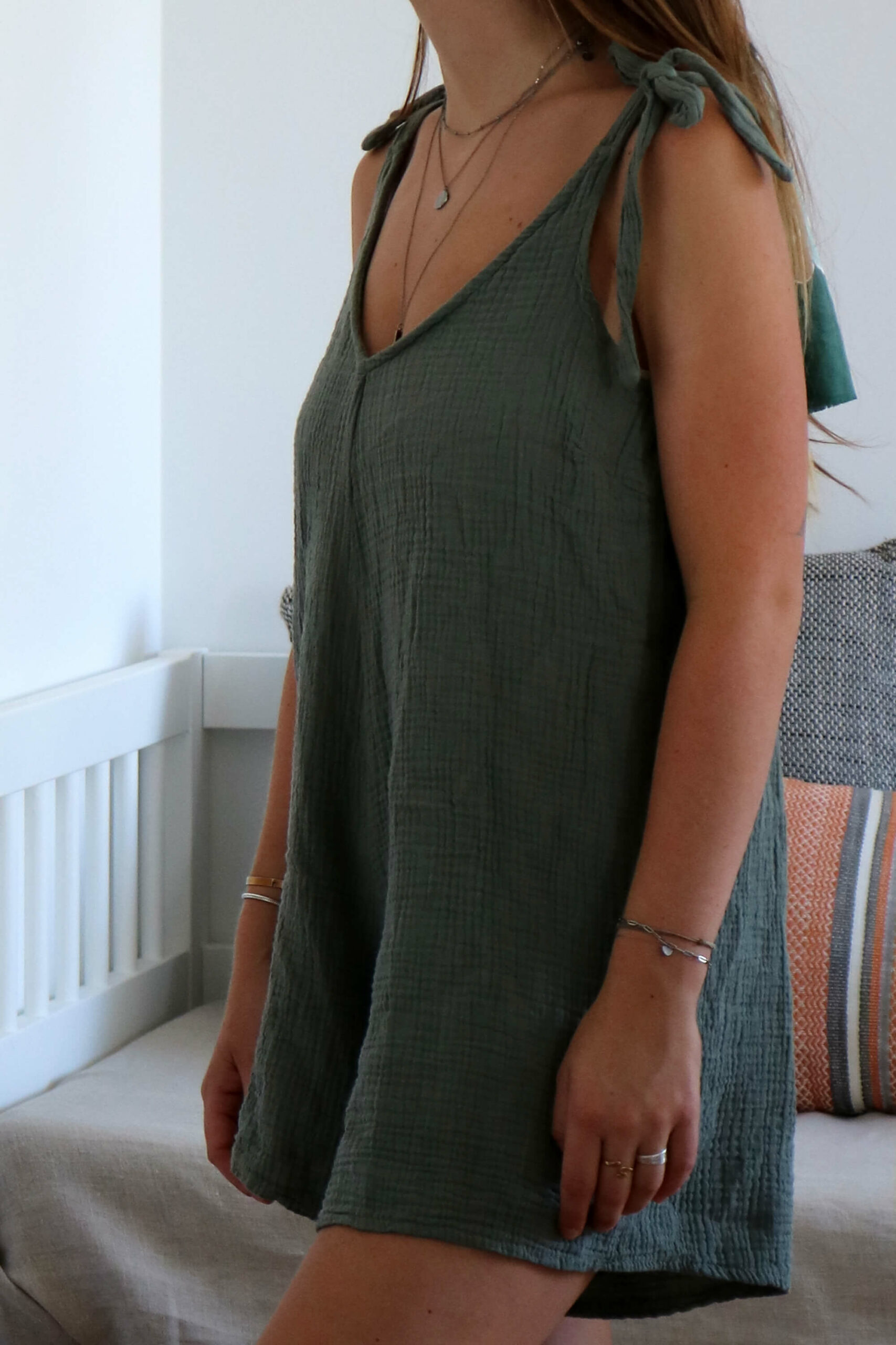 La gaze de coton : matière indispensable de la saison. Respirante, elle assure une bonne circulation de l’air pour rester confortable toute la journée. Ce combishort femme nous séduit par sa matière gaufrée, son toucher ultra doux et sa coupe oversize. Une combinaison courte avec des bretelles fines à nouer qui permettent de les régler comme bon vous semble. Un combishort en gaze de coton à porter avec des sandales plates ou une paire de baskets, en toute simplicité.