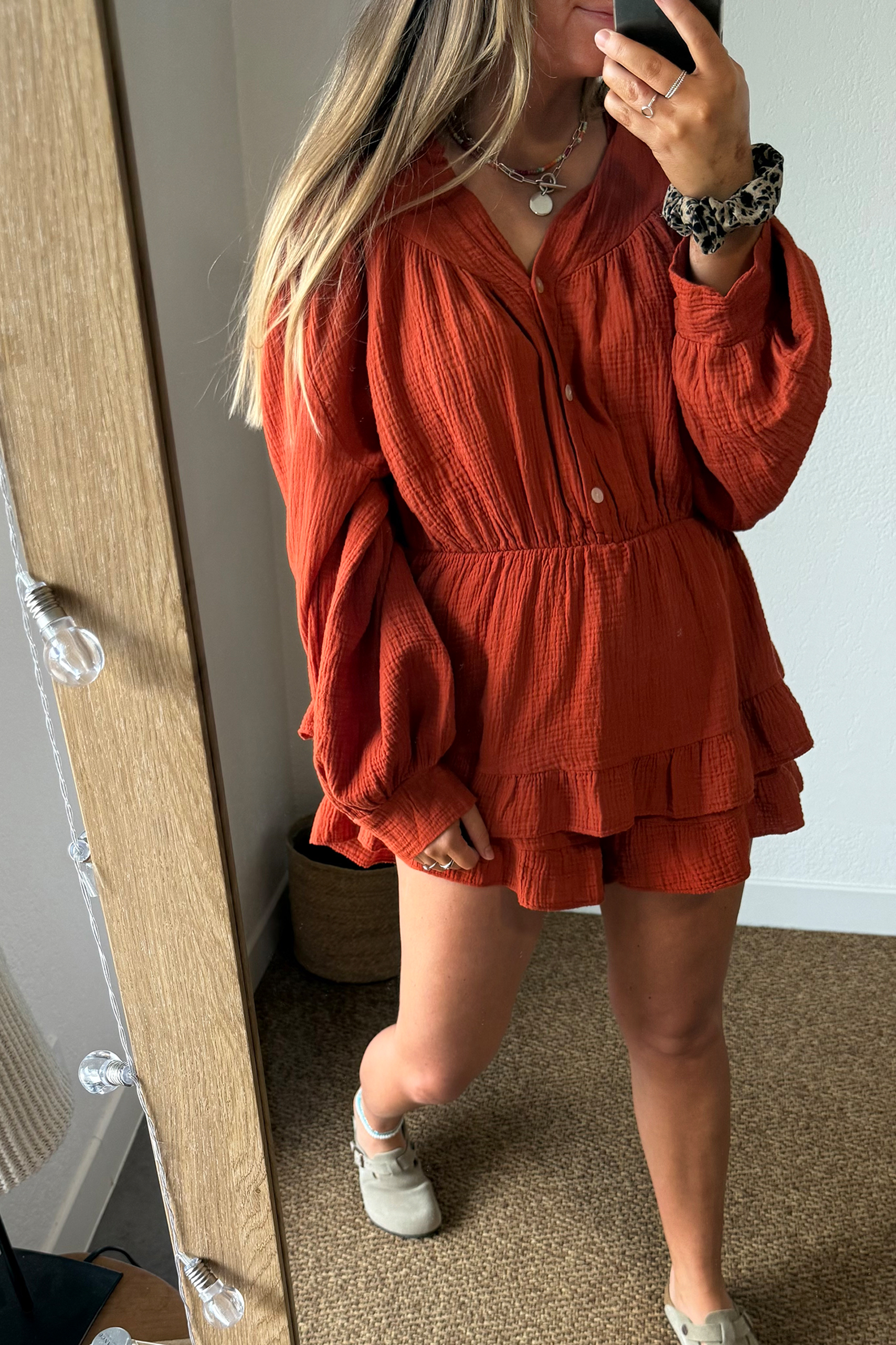 Adoptez un style bohème et décontracté avec cette combishort terracotta en gaze de coton. Légère et fluide, elle se distingue par son effet bouffant au niveau des manches et ses volants élégants au niveau du short, offrant un look à la fois féminin et tendance. Parfaite pour les journées estivales, elle allie confort et esprit bohème pour une silhouette moderne et aérienne.