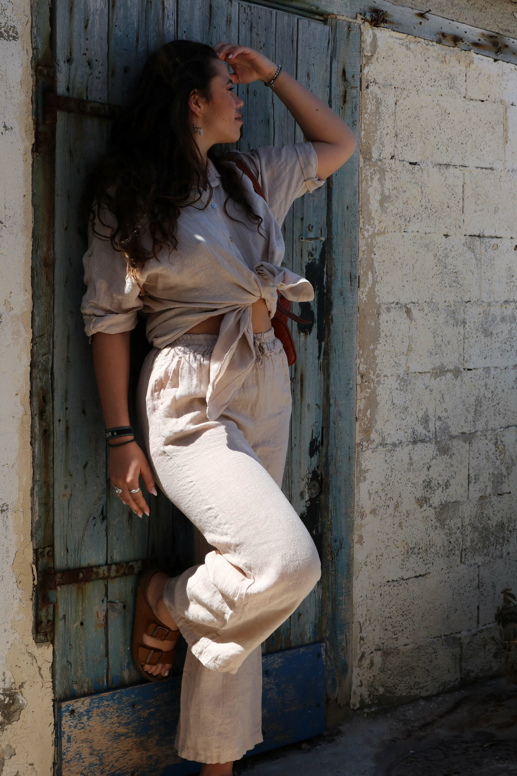L’ensemble en lin pour femme beige est idéal pour arborer un look décontracté et classe. Doté d’une texture fraîche, sa coupe permet de l’associer aisément à d’autres vêtements et accessoires pour une allure adaptée à toutes les occasions. Alors, vous aimez ?