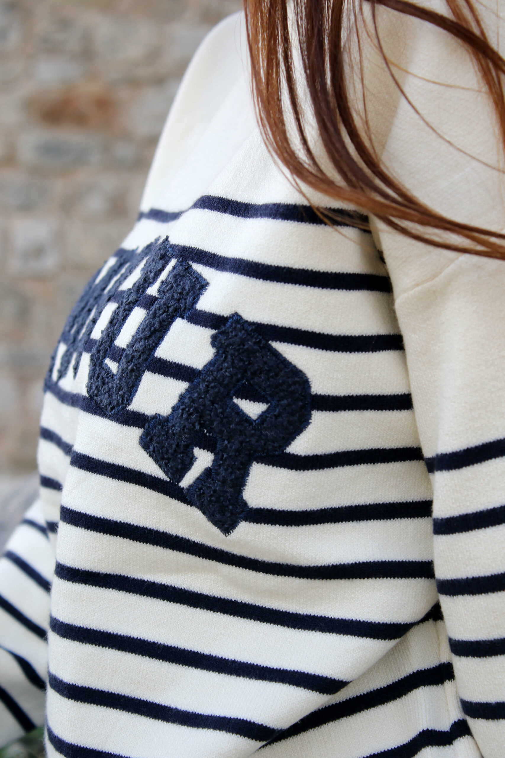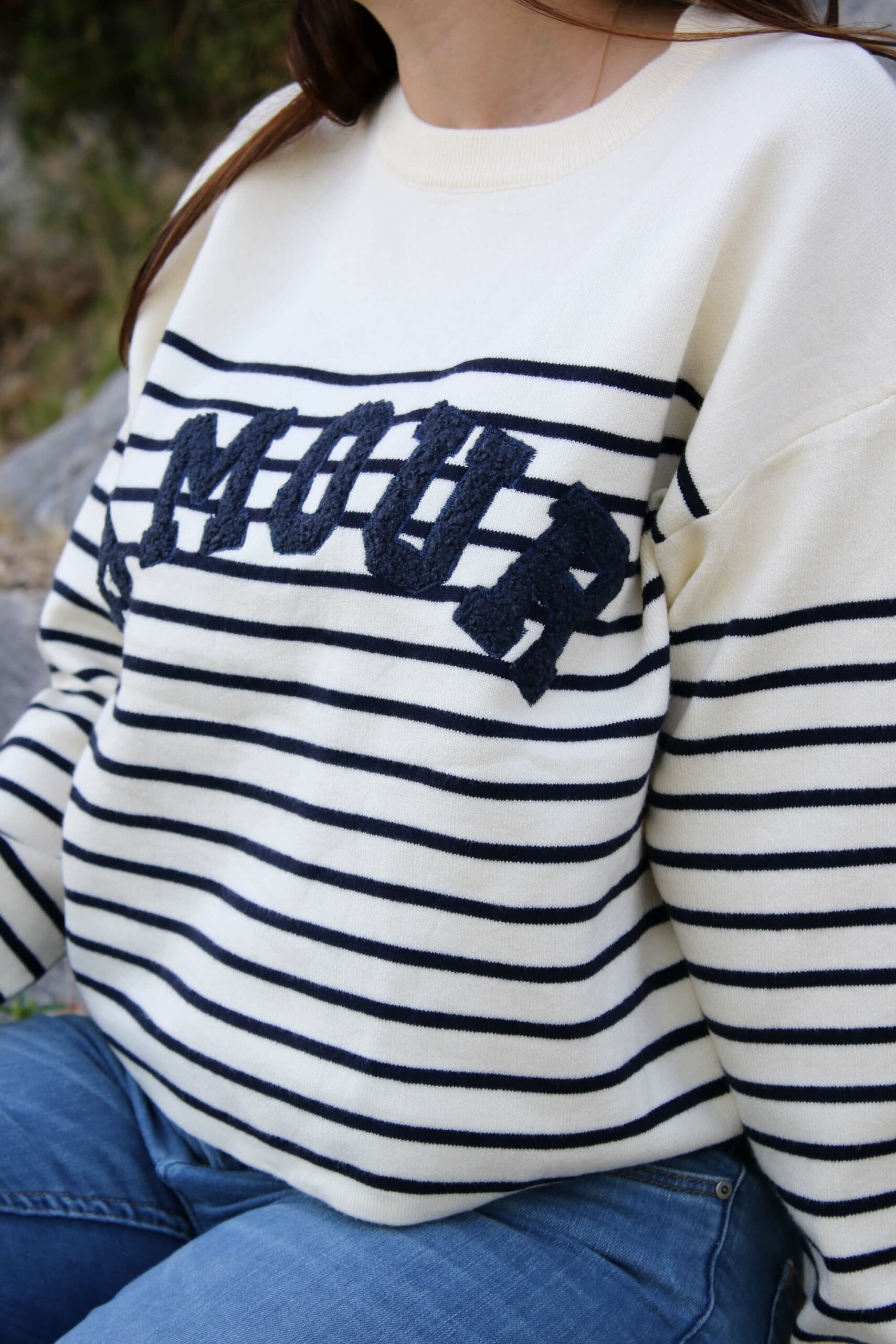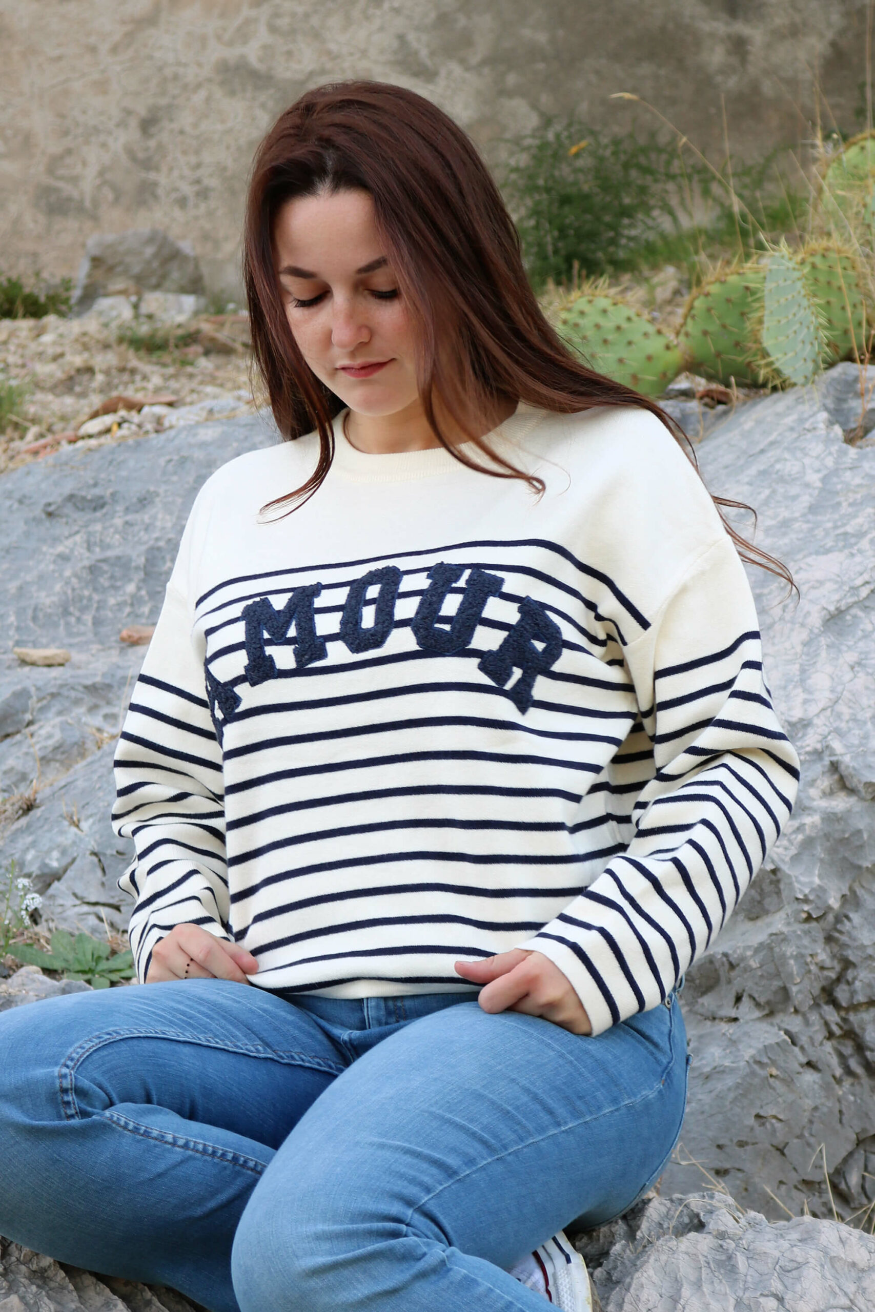Blottissez-vous dans ce joli pull marinière amour, qui fait battre nos coeurs.