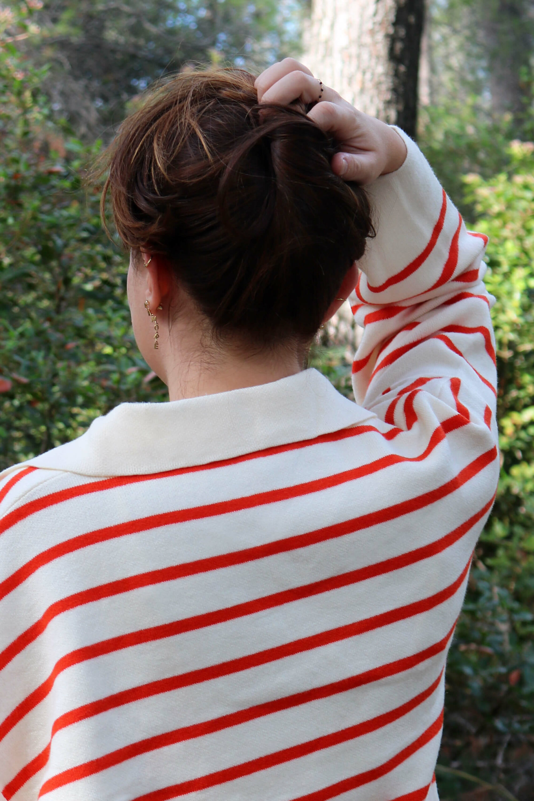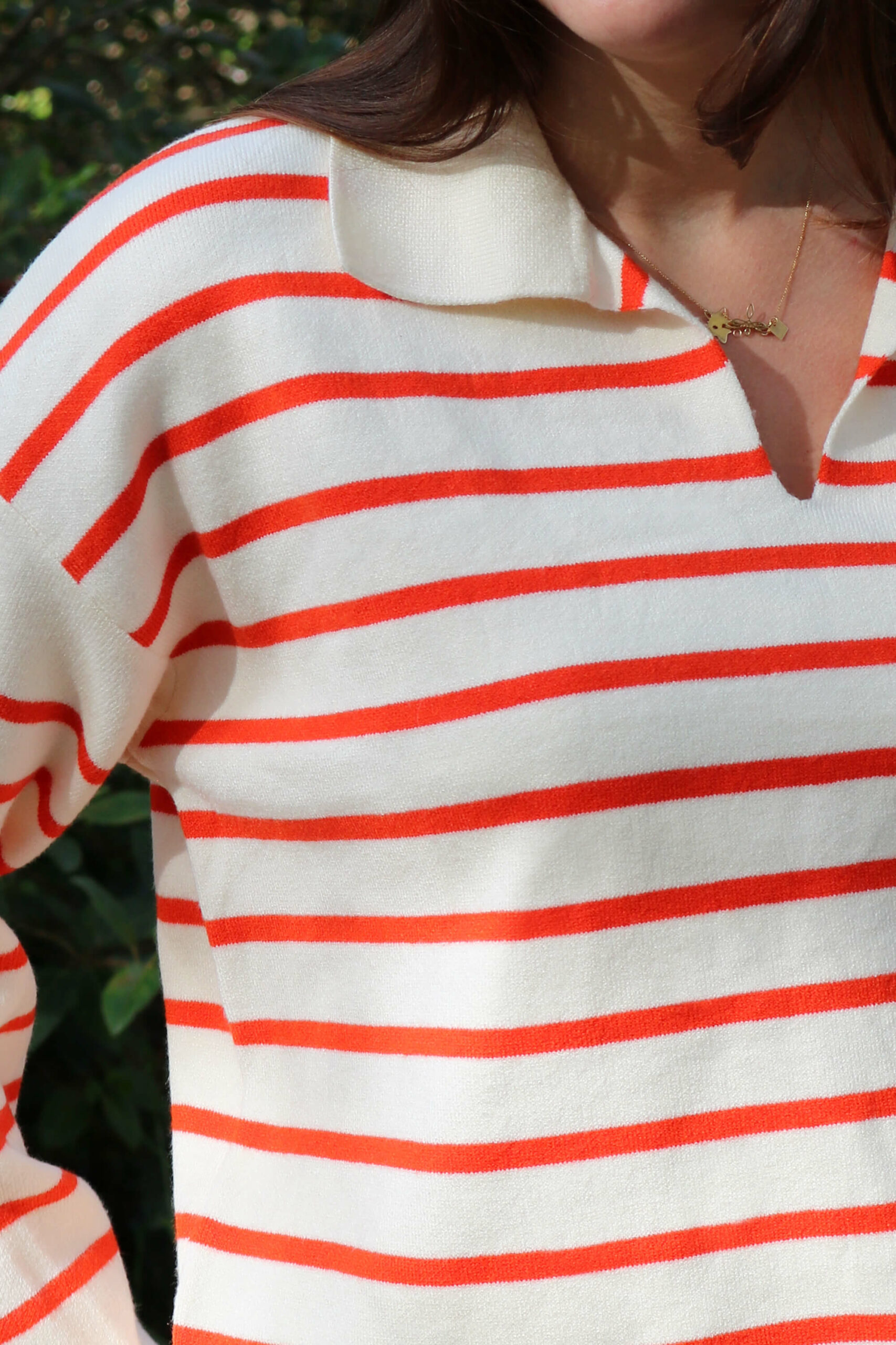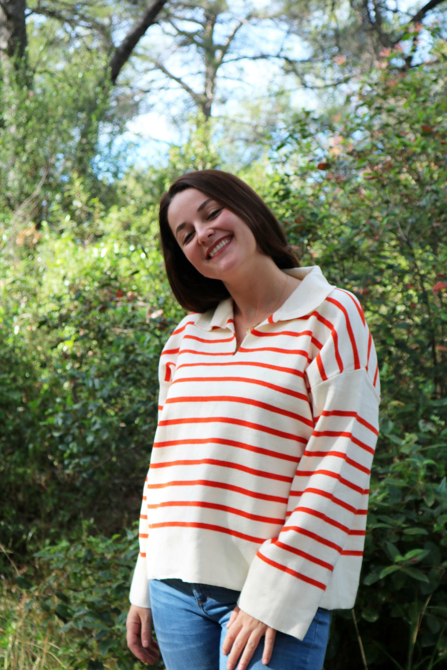 Blottissez-vous dans ce joli pull marinière orange et blanc au col camionneur. Coupe oversize, facile et très agréable à porter… nous, on craque !