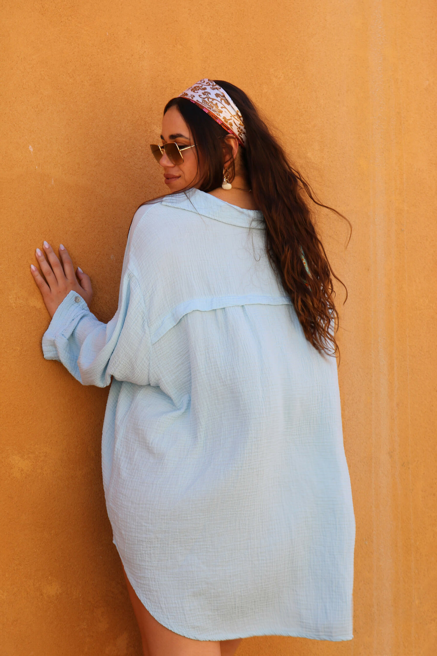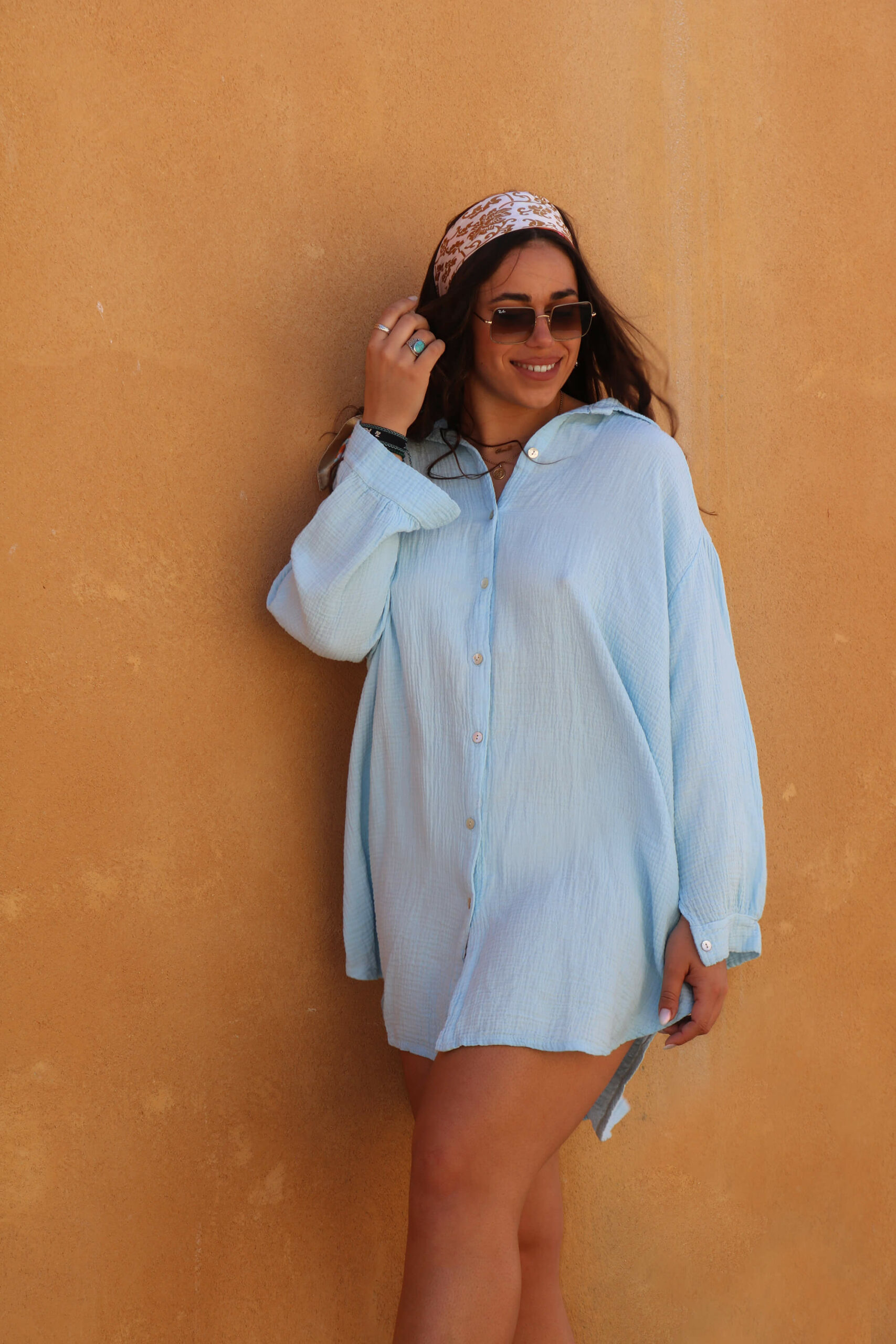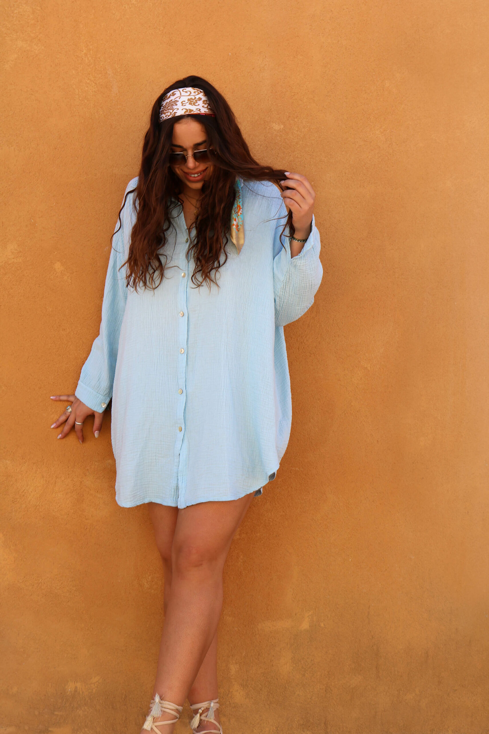 ROBE CHEMISE EN GAZE DE COTON BLEU CIEL – MITI