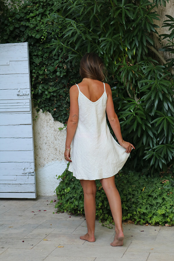 Craquez pour la robe courte en lin beige Ono, hyper mignonne et élégante, avec ses fines bretelles et sa coupe légèrement évasée. 100 % lin, fabriquée en Italie, elle allie confort et style pour le printemps et l’été, parfaite en ville, en vacances ou pour un look raffiné.