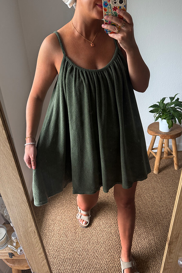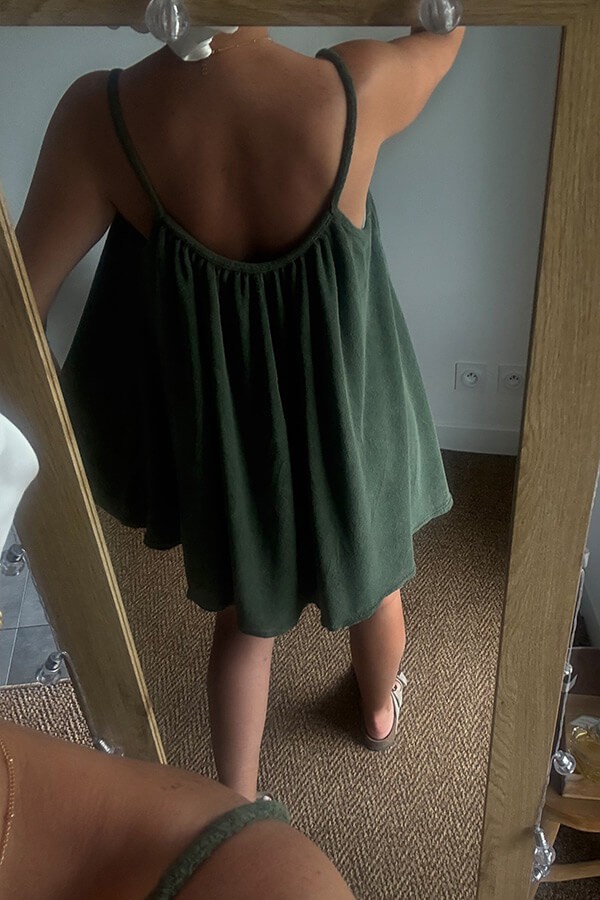 Légère, douce et féminine, la robe courte en éponge kaki est la pièce parfaite pour l’été. Avec son col rond, ses fines bretelles et sa coupe vaporeuse, elle offre un style simple et chic qui met en valeur les petites tailles. Son tissu éponge ultra confortable en fait une robe idéale aussi bien pour la plage que pour une sortie en ville. Un essentiel estival à la fois pratique, élégant et facile à porter !