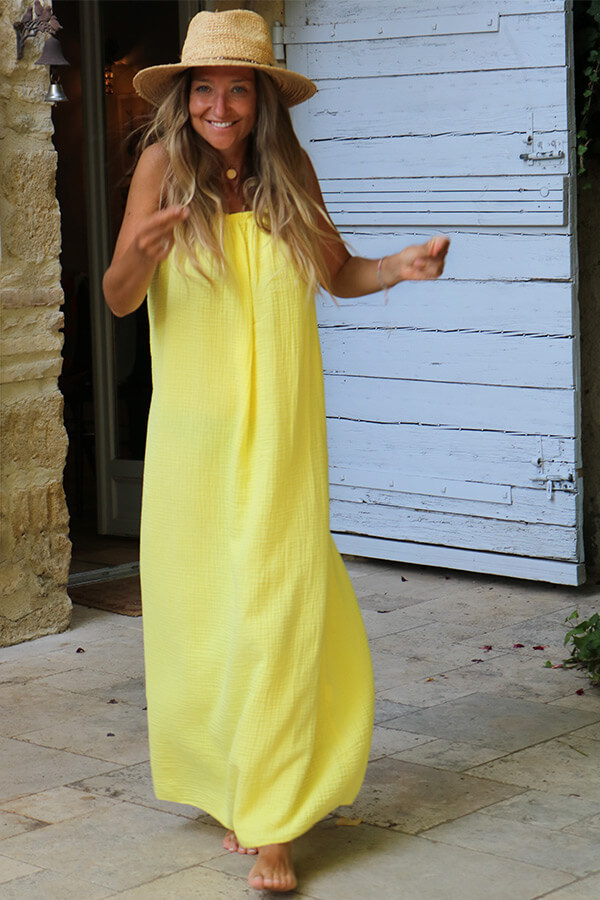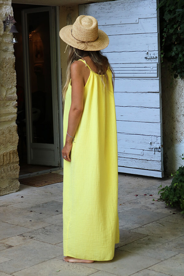 La robe Noanoa en gaze de coton est la robe légère parfaite pour l’été. Longue, fluide et aérienne, elle suit vos mouvements avec naturel et offre un confort incomparable grâce à sa matière douce et respirante. Son style bohème chic et sa couleur jaune solaire en font une robe été tendance qui illumine le teint et met en valeur le bronzage.