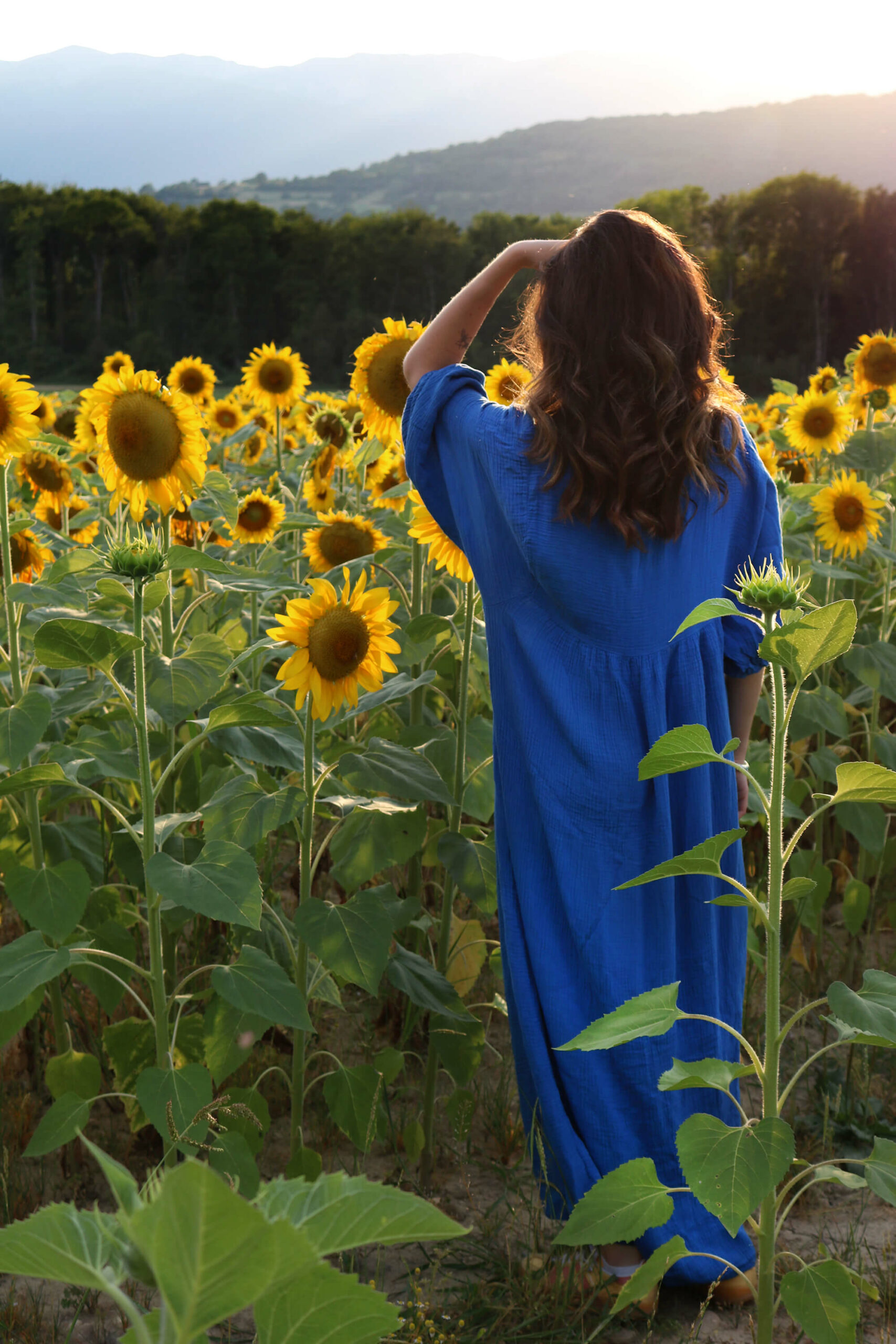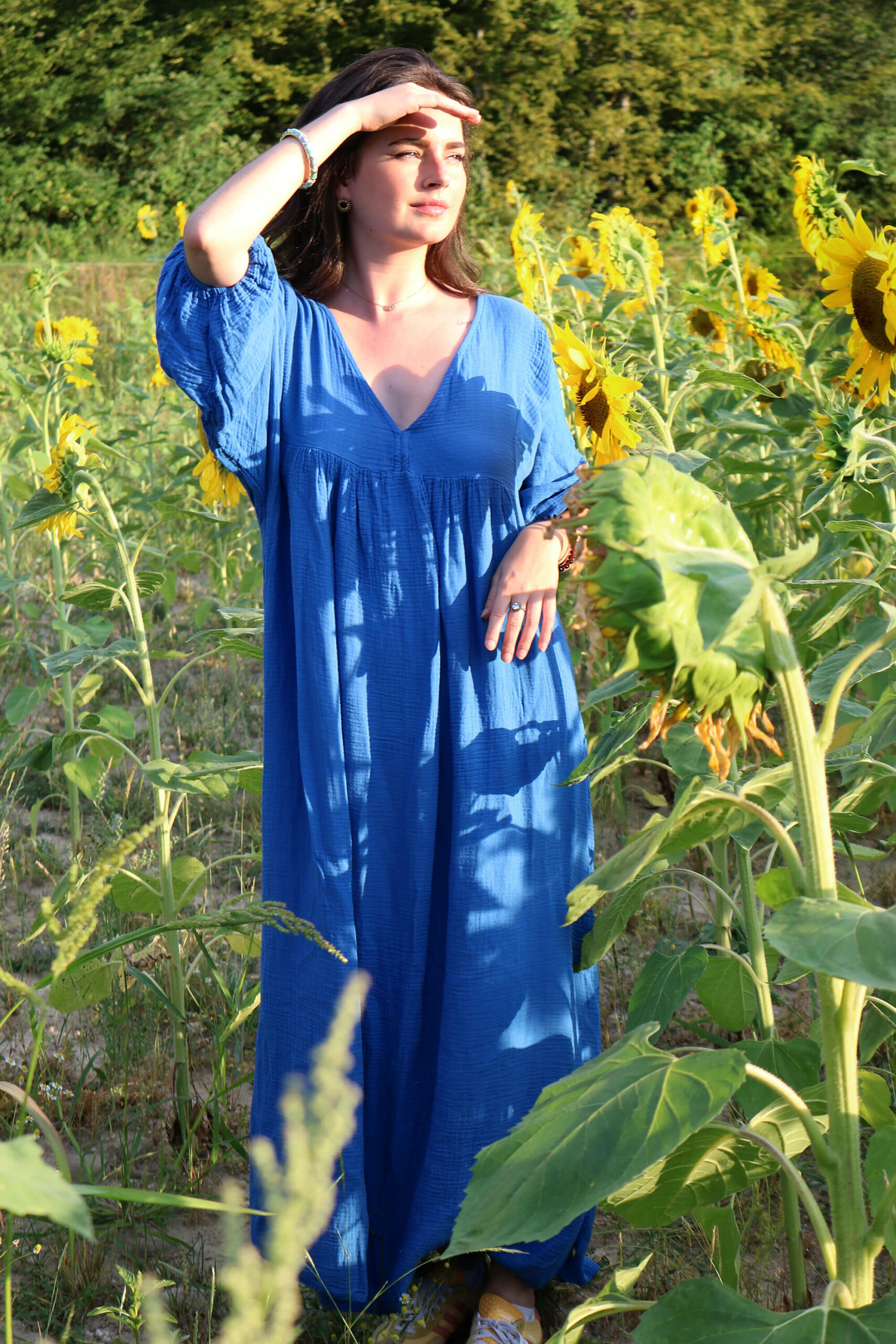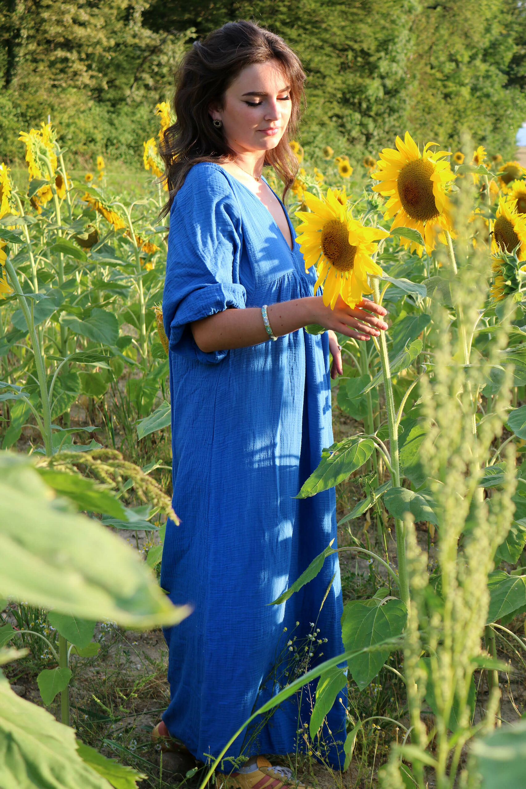 ROBE LONGUE EN GAZE DE COTON BLEU ROI – TEMIHI