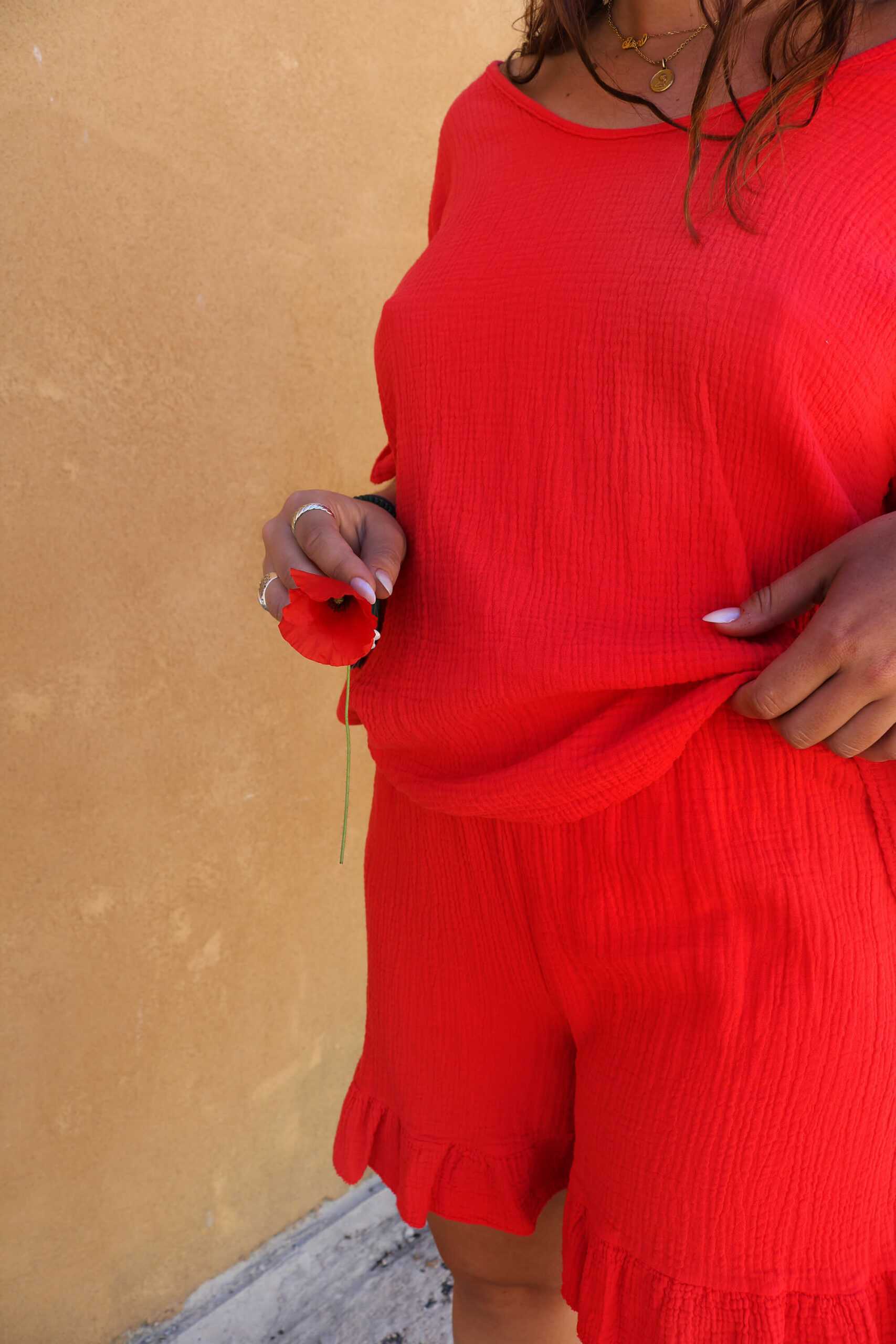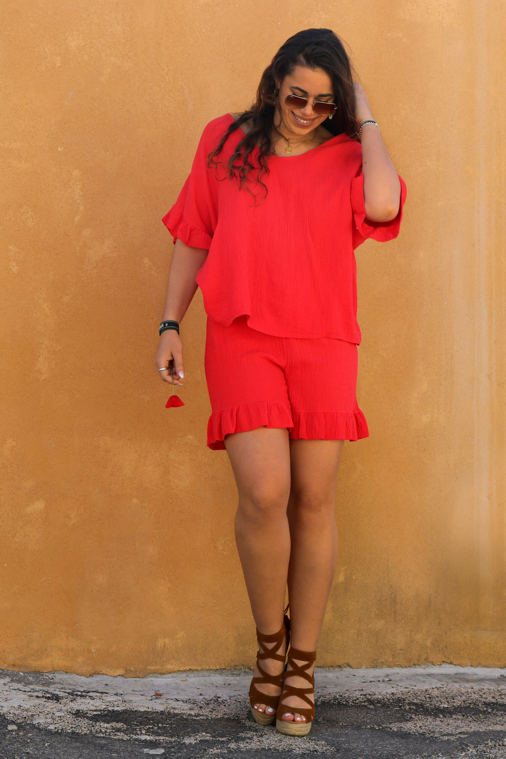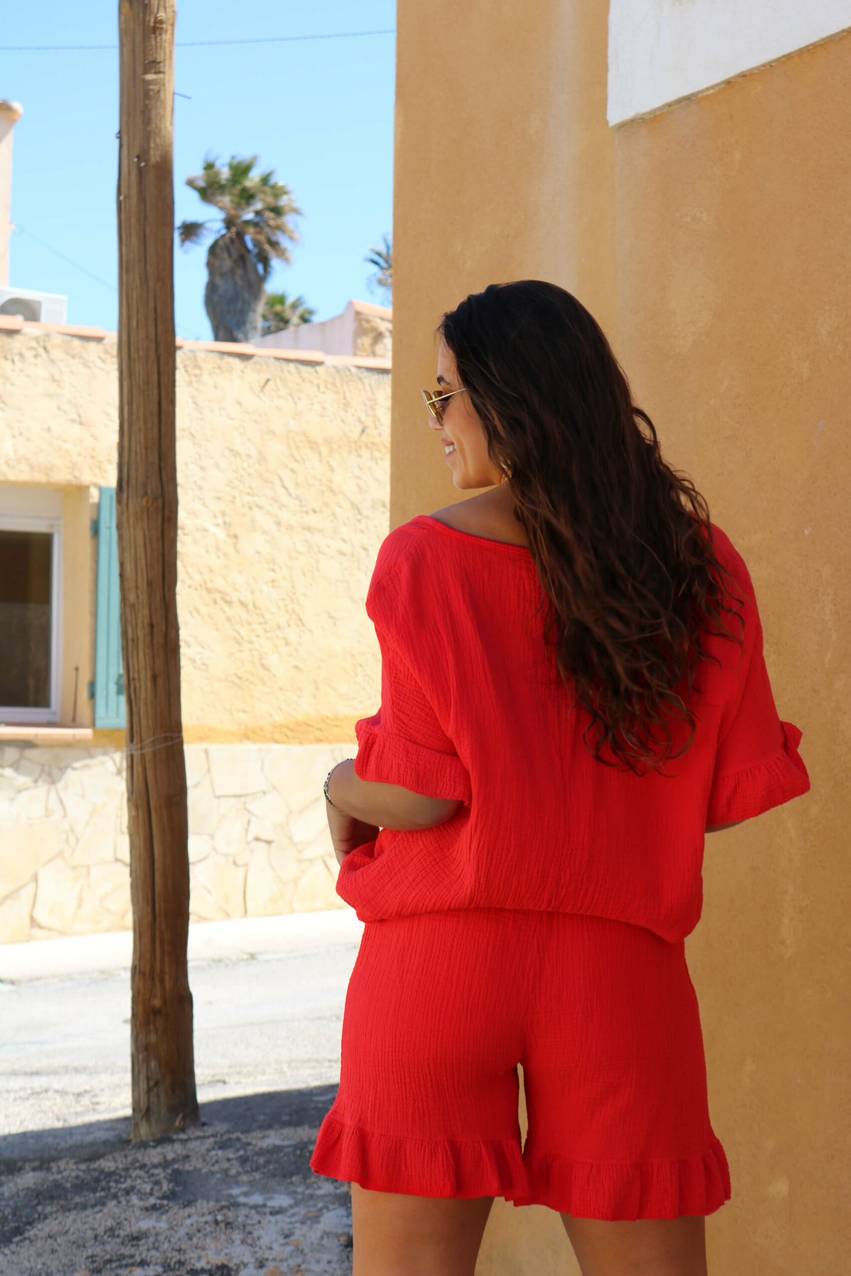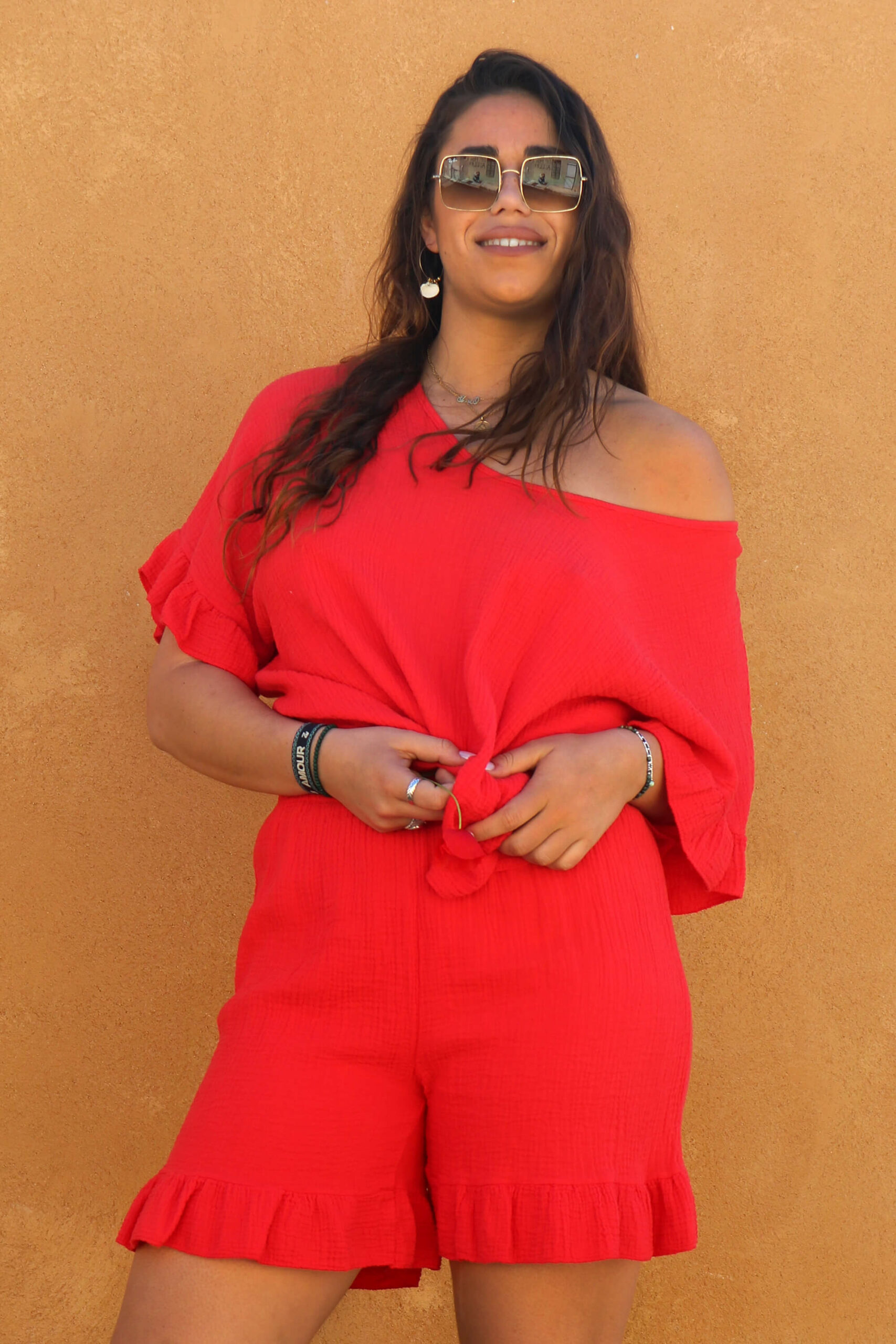 Un ensemble en gaze de coton tout léger, fluide et si agréable à porter. Il est parfait pour la saison estivale ! Et les volants au niveau du short, nous on craque complètement pour ce détail.