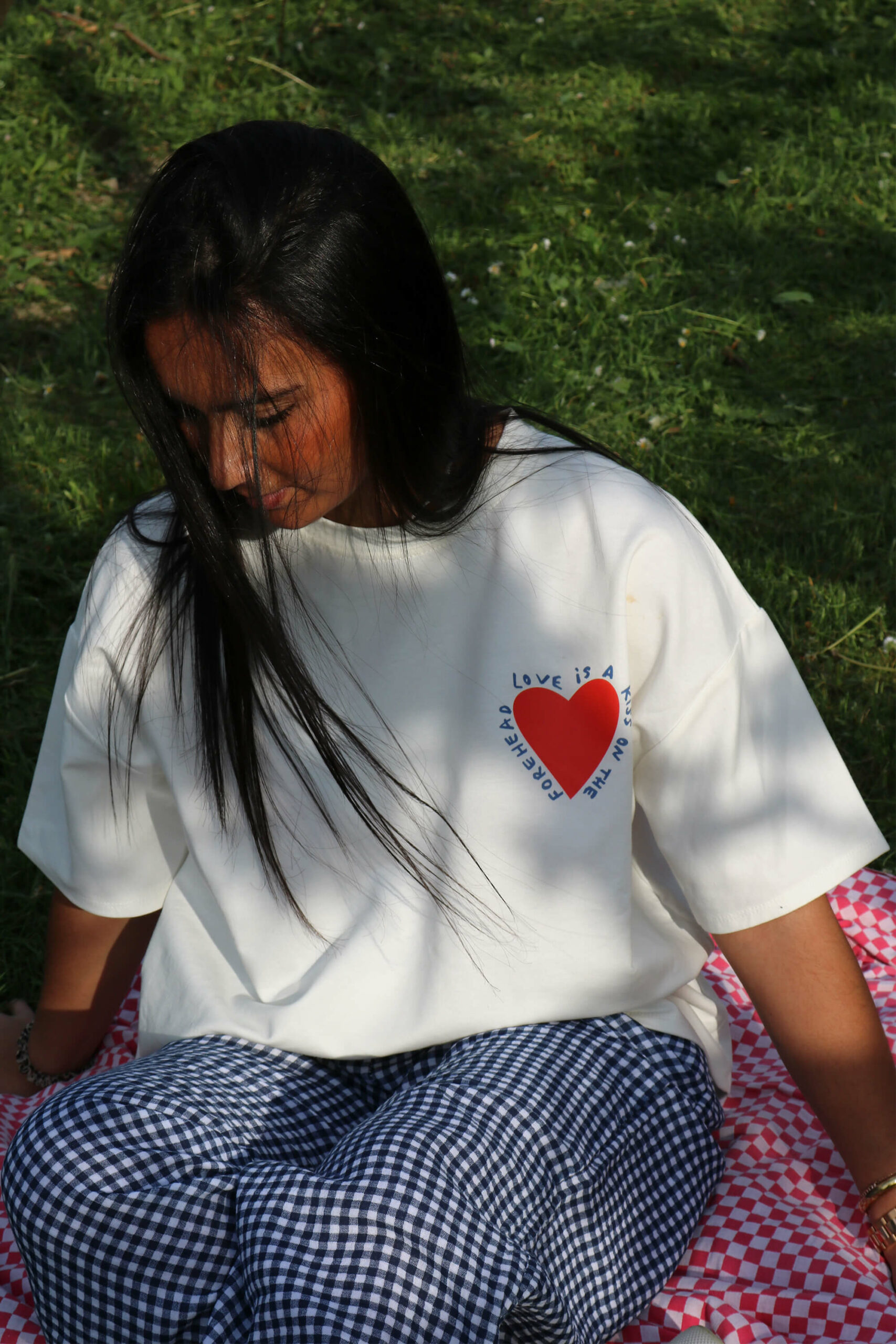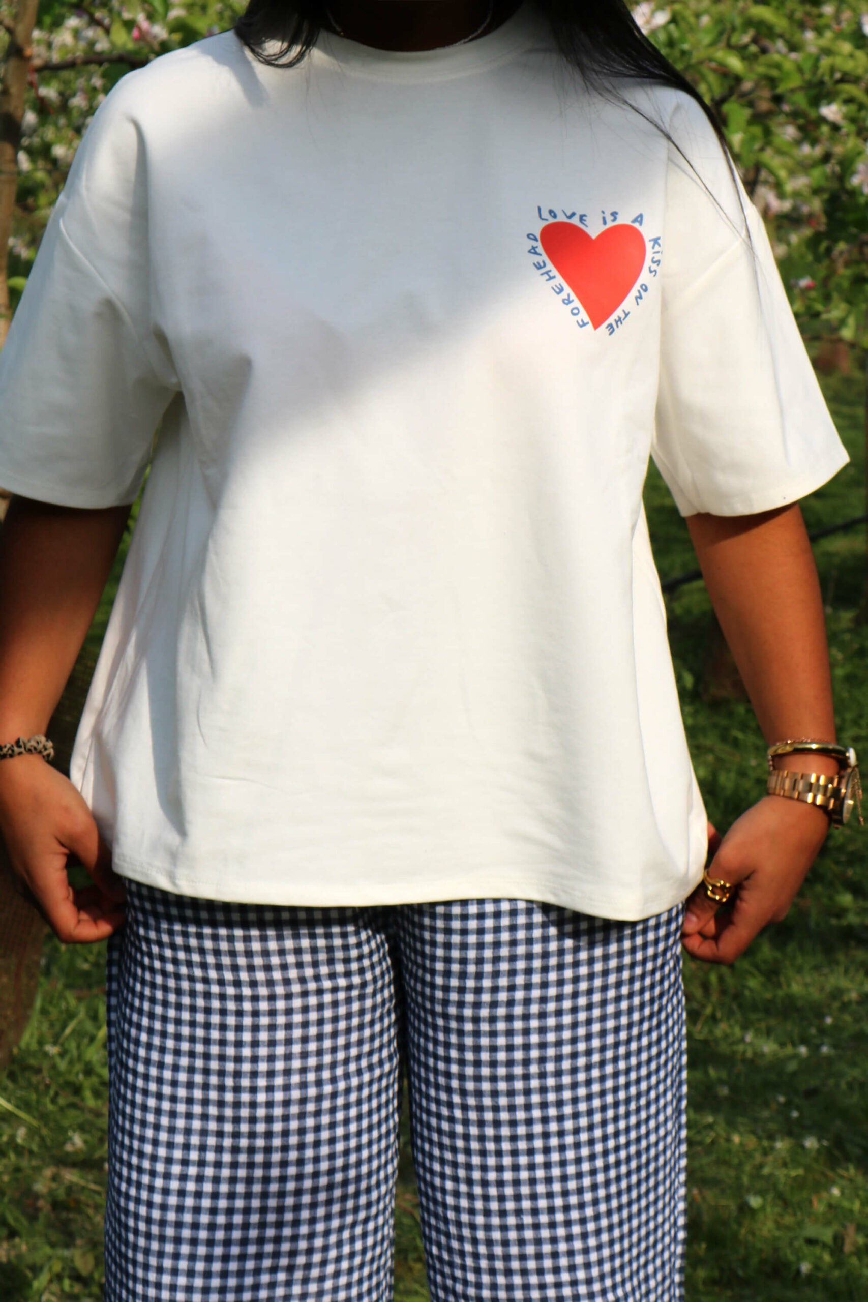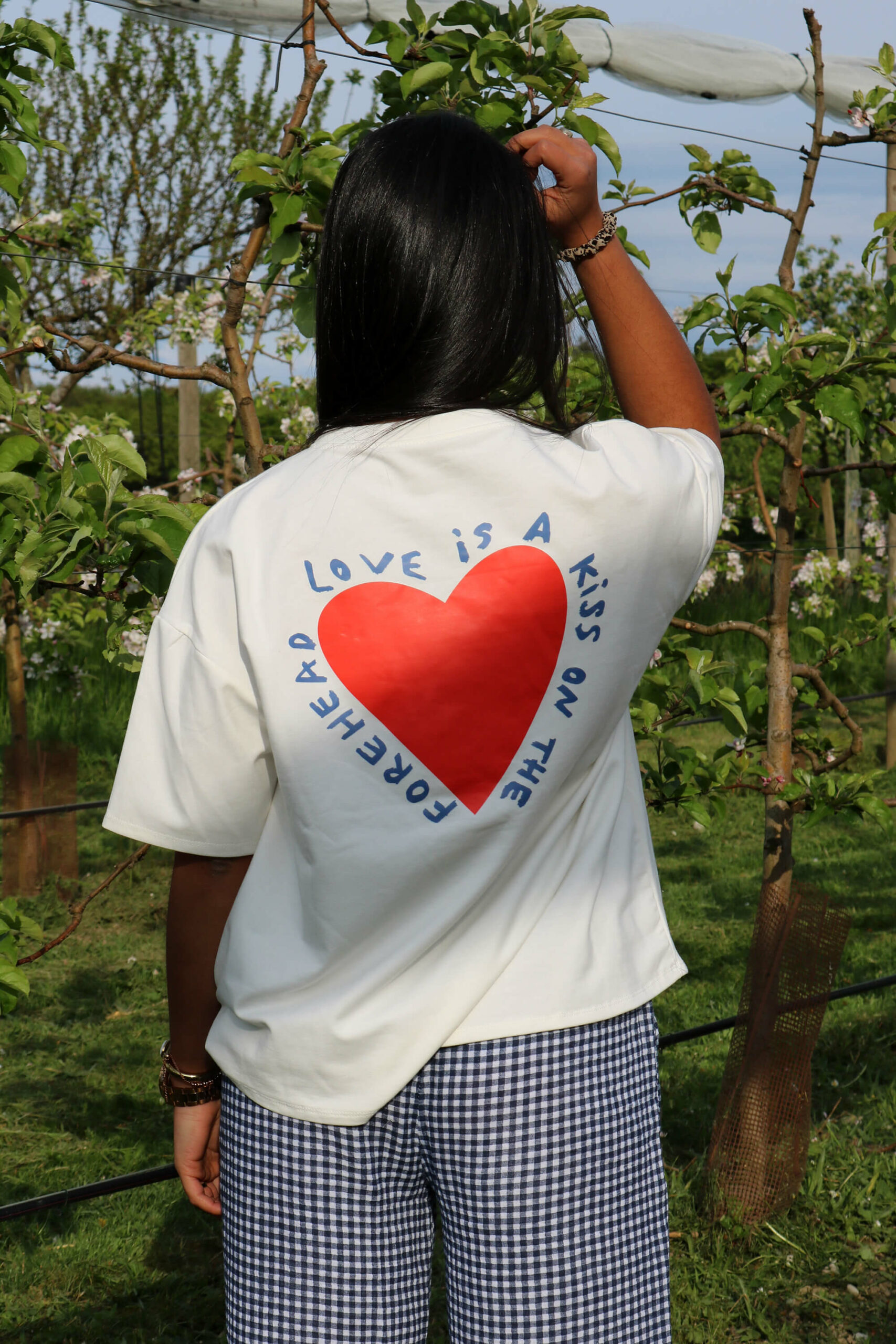 Ce t-shirt oversize blanc est un véritable coup de cœur. Avec son joli dessin de cœur et la typo « Love is a kiss on the forehead », il incarne une vibe douce et positive qui fera fondre tous les cœurs. En coton ultra doux et coupe loose, ce t-shirt est un parfait mélange de confort et de style. Il se porte facilement pour un look casual et tendance, que ce soit avec un jean, une jupe fluide ou même un short pour les journées ensoleillées. Un must-have pour les amoureux du style simple, chic et plein de tendresse. Inspiration douce, look décontracté, message d’amour : vous allez l’adorer.